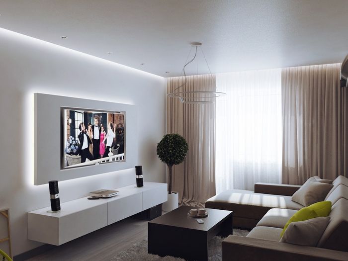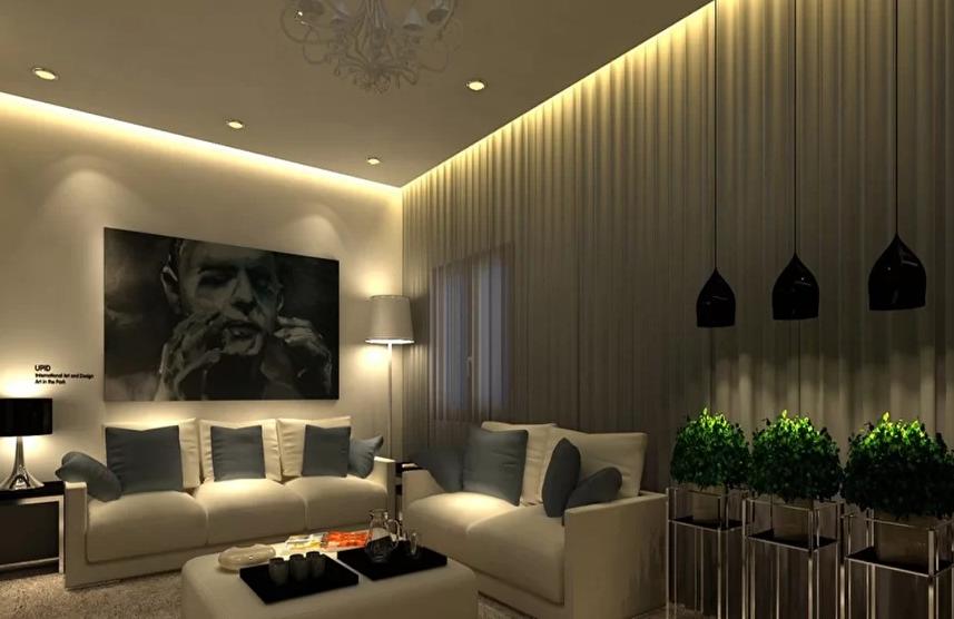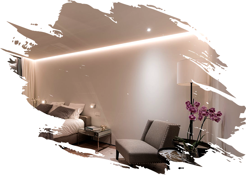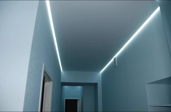 Использование светодиодной ленты только в одной части двухуровневых конструкций позволит сделать парящим только фрагмент всего полотна. Использовать такой натяжной потолок можно в гостиной, спальне, детской комнате, а также любом другом помещении. С помощью этой конструкции можно зрительно расширить комнату и придать ей нужную геометрическую форму.