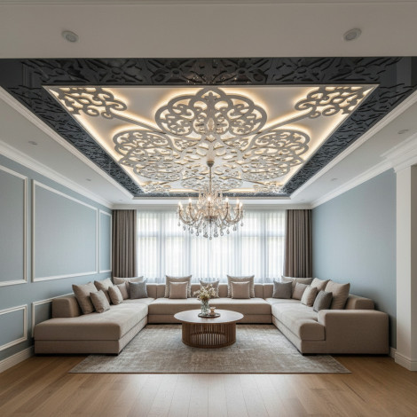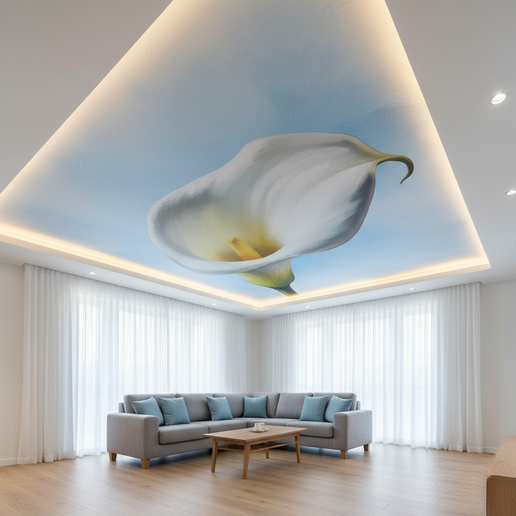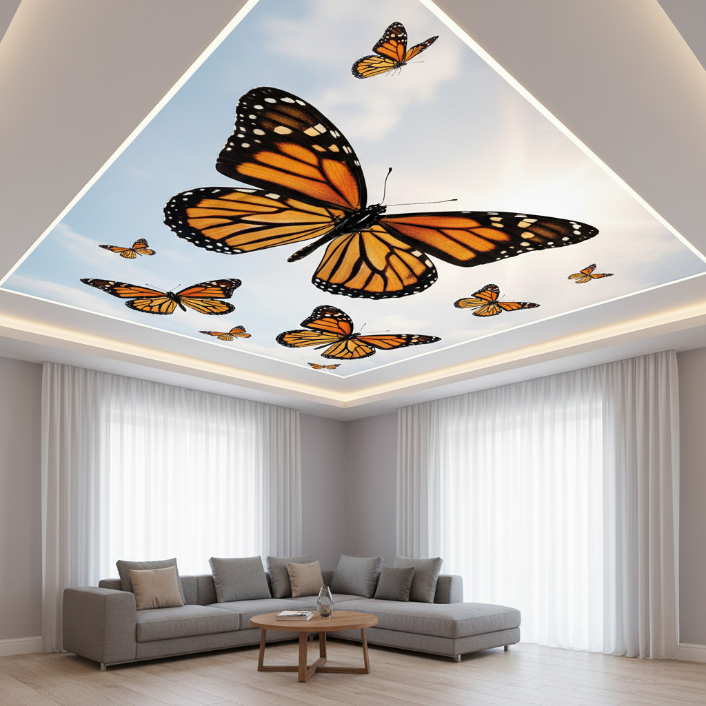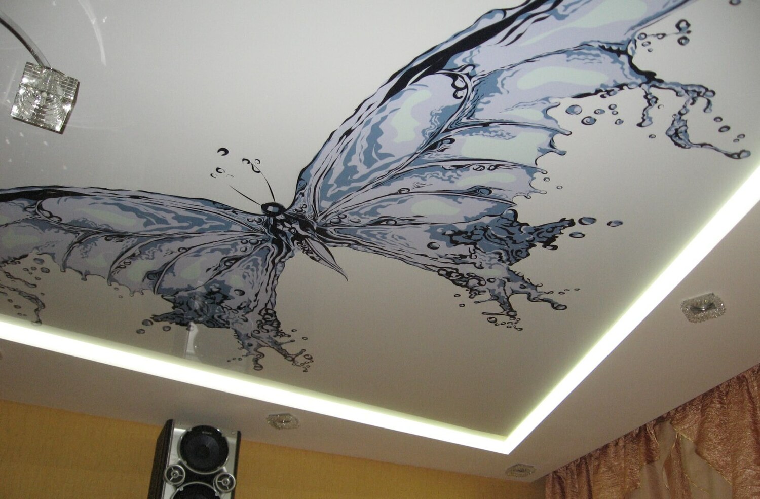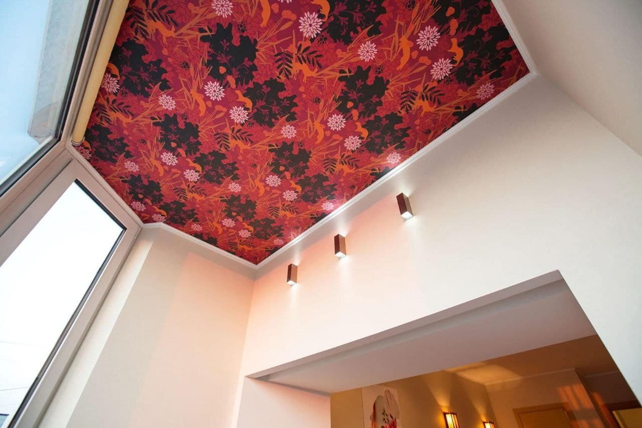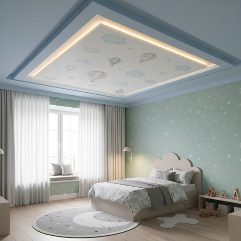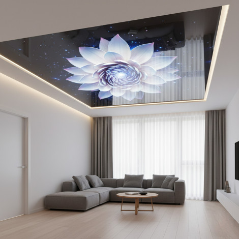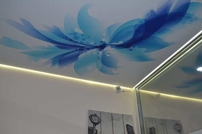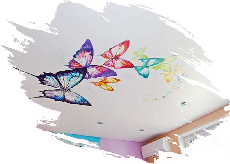 Виды интерьеров с использованием натяжных потолков с фотопечатью впечатляют размахом дизайнерских решений. Самым популярным Омск является украшение детской комнаты рисунком в виде любимого героя из мультфильма или комиксов. Также можно обыграть контрастность, подобрав оттенок, делающий акцент на цвете обоев или предметов мебели. Если на полу лежит ковер, можно подобрать рисунок аналогичной цветовой гаммы. Для интерьера, выполненного в стиле минимализма, подойдет абстрактный рисунок, а для ванной комнаты — морские мотивы.