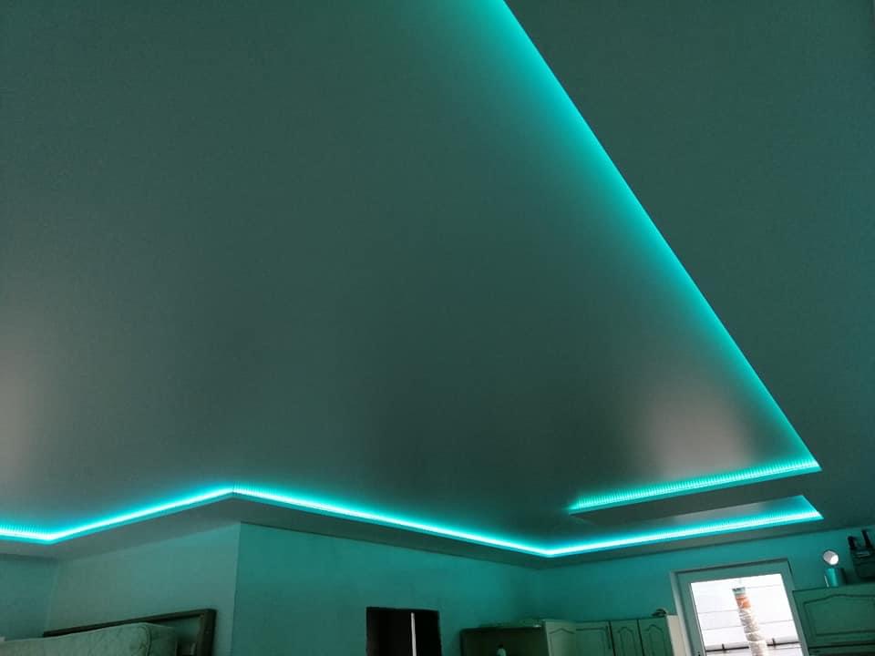Натяжной потолок с подсветкой прослужит долго, поскольку лампочки рассчитаны на 100 тыс. часов работы, мгновенно разгораются.