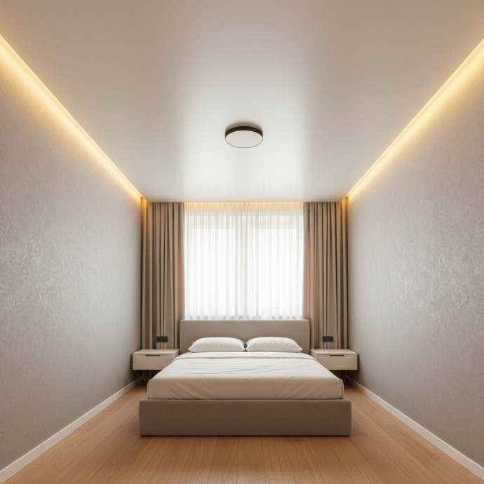 - привлекательный внешний вид и универсальность – в любом интерьере сатиновый потолок будет выглядеть великолепно, главное – правильно подобрать оттенок;