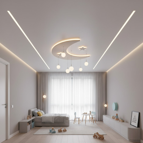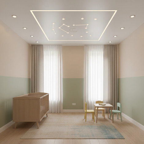 Освещение, вмонтированное в разные уровни конструкции, может быть различным: насыщенным над письменным столом и умеренным над кроватью ребенка, что очень удобно.