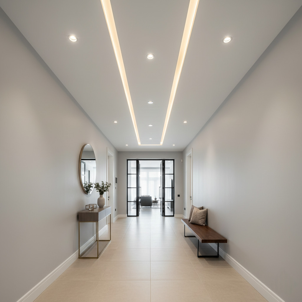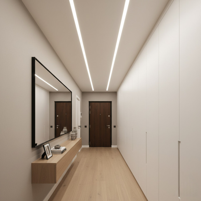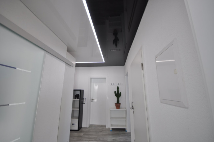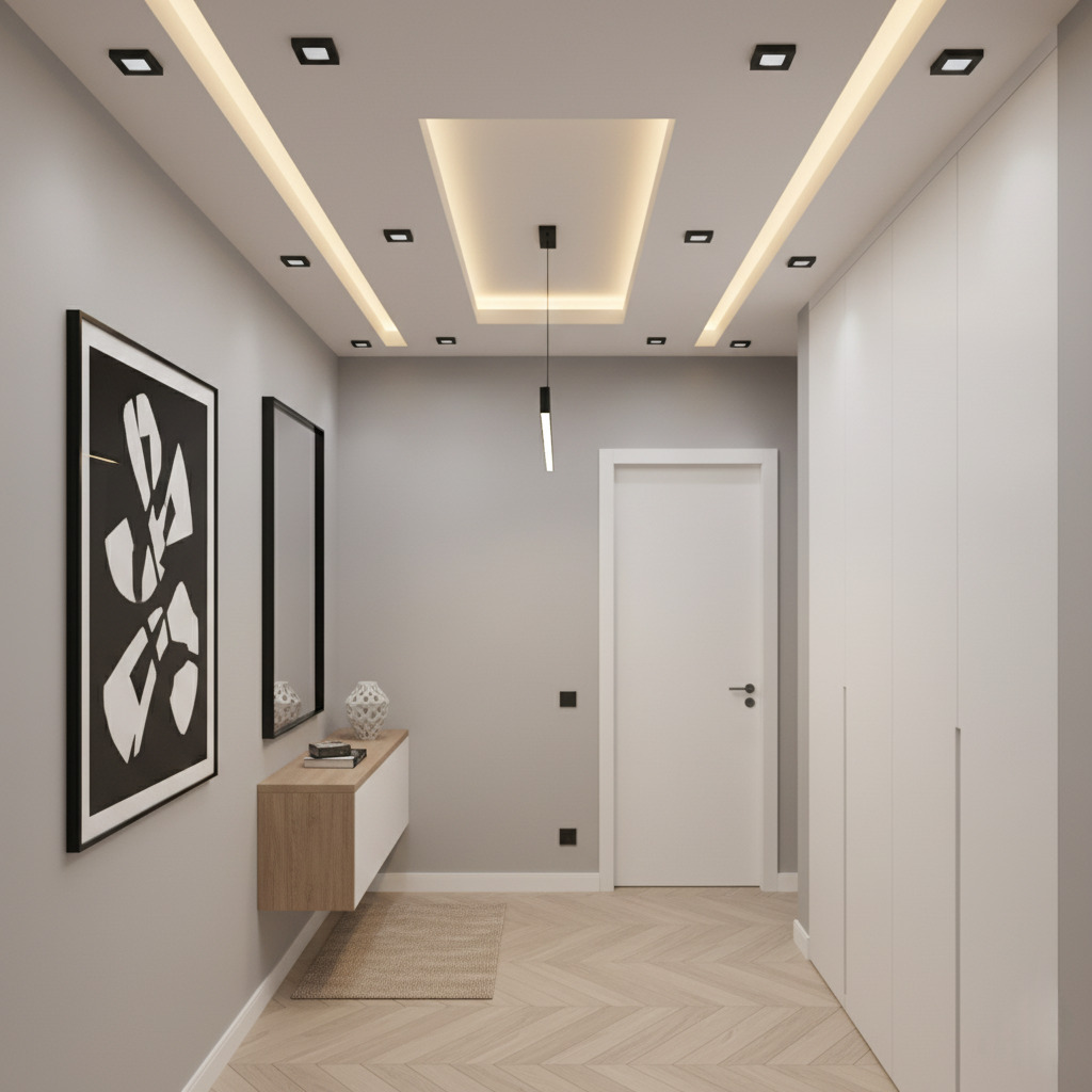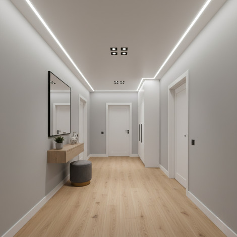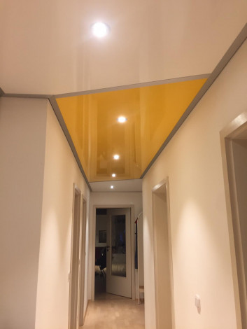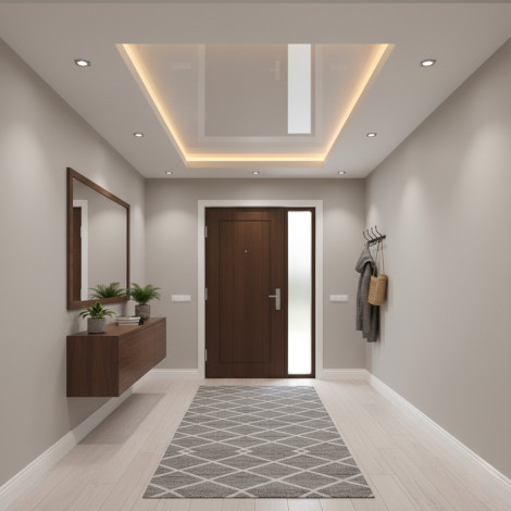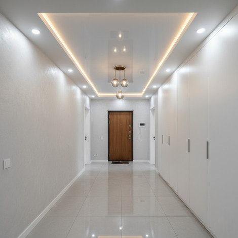 Матовый в темных или светлых тонах идеально подойдет для большого коридора, подчеркнув простор. Под заказ можно создавать не только одноуровневые, но и многоярусные конструкции с натяжными потолками, комбинируя цвет и покрытие.